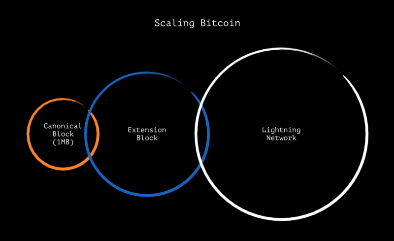 Pero ¿cómo funciona esto? En realidad es muy sencillo. Los EXT-B, son extensiones que se fijarían al bloque al momento de su activación para aumentar la cantidad de información que puede ser manejada en cada uno: sería como agregar un vagón más al tren inicial. Es decir, se trata de aumentar la capacidad del bloque sin necesidad de aumentar su tamaño actual mediante un hardfork, sino añadiéndole un bloque auxiliar a través de un softfork. De ser implementados, los fondos podrían transferirse fácilmente del bloque canónico (el actual de 1 MB) al bloque de extensión, preservando la canjeabilidad. Adicionalmente, se añadirían funciones para contratos inteligentes y se podría interactuar con la Lightning Network, que permite llevar a cabo transacciones fuera de Bitcoin de forma segura.