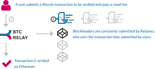 Esta herramienta utiliza la verificación de pagos simplificada de Bitcoin (simplified payment verification o Bitcoin SVP) para comprobar la legitimidad de las operaciones con Bitcoin. Para esto, un grupo de miembros de la comunidad llamados “Relayers” envían a la red los blockheaders de Bitcoin para construir una mini-versión de la blockchain y verificar el número de confirmaciones de las transacciones recibidas. Cada vez que una transacción entre la Blockchain de Bitcoin y la de Ethereum es confirmada, el relayer que envió el blockheader utilizado para dicha confirmación obtiene una comisión en ethers. Quienes utilicen la red de Ethereum pueden hacer llamadas API a BTC Relay para verificar los eventos en la red de Bitcoin.