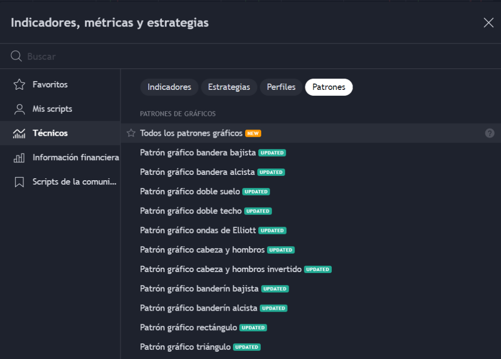 En total, y por ahora, son 16 los patrones gráficos detectados por Tradingview. En la imagen a continuación se observa una fracción de la extensa lista de ellos.