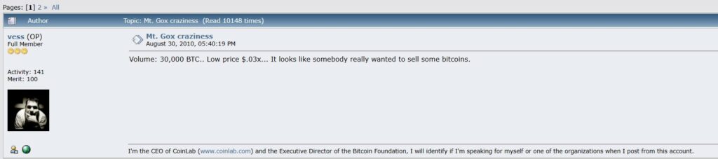Según permite ver el foro pionero sobre el ecosistema, Bitcoin Talk, el por entonces CEO del exchange CoinLab, Peter Vessenes, publicó el 30 de agosto de 2010 que alguien había puesto a la venta 30.000 bitcoins “por un bajo precio”. Detalló que vendía cada moneda a USD 0,03, lo que equivalía a un total de USD 900.