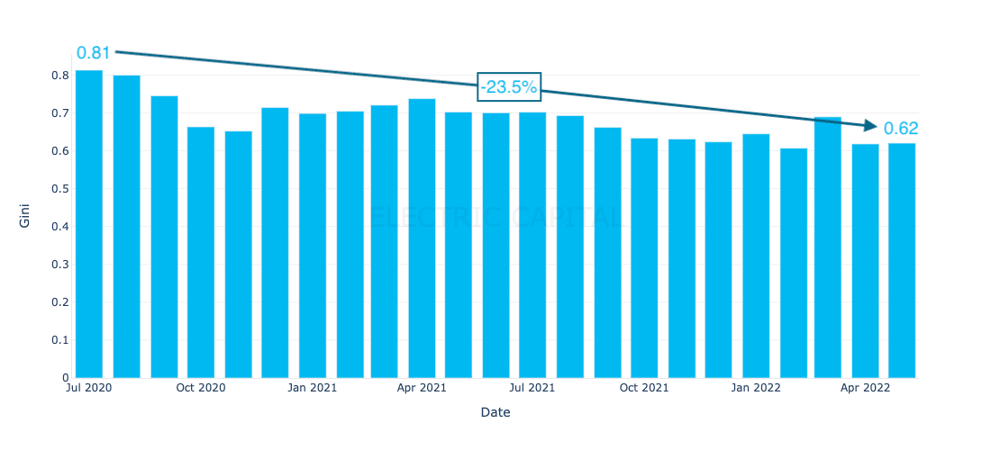 Como se ve en el gráfico de arriba, la buena noticia es que el promedio de todas las DAO en el coeficiente de Gini ha bajado de 0,81 a 0,62. Esto representa una reducción del 23% aproximadamente y, en definitiva, una mayor descentralización a la hora de decidir sobre aspectos básicos del protocolo.