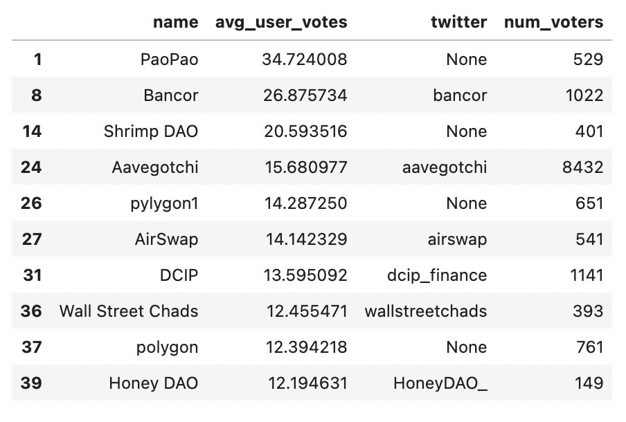 Lograr que una comunidad participe activamente de la gobernanza no es tarea sencilla, según estos datos. No obstante, como se muestra en la imagen a continuación, algunas DAO tienen una comunidad muy fiel. Esto es así a tal punto que varias de ellas registran un promedio de más de 10 votos por usuario.