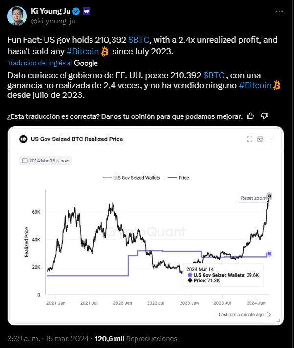Ahora, el director de CryptoQuant, Ki Young Ju, ha detectado nuevas señales las cuales estarían indicando que el Departamento de Justicia de Estados Unidos, el Servicio de Impuestos Internos y otros organismos gubernamentales, no han vendido nada de los BTC que mantienen almacenados, desde julio de 2023.