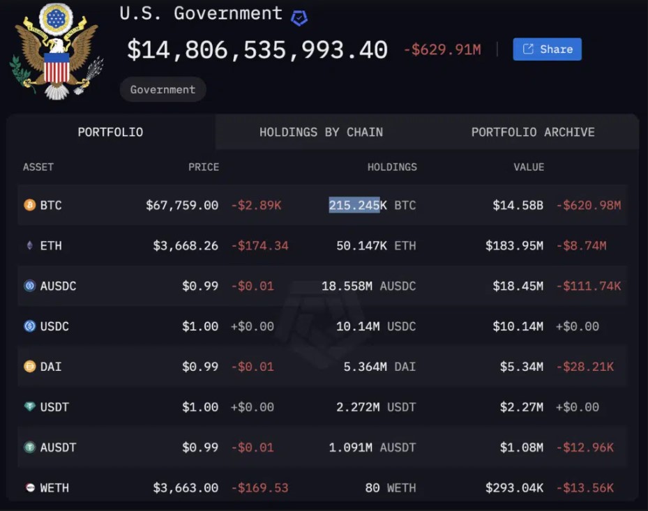 Aunque los analistas de la plataforma Arkham tienen datos diferentes, y al respecto indican que las direcciones que supuestamente pertenece a las autoridades estadounidenses, almacena 215.245 BTC. Además de bitcoin, el monedero estadounidense contiene 50.147 ethers ( ETH ), 10,14 millones de USDCoin ( USDC ), 5,36 millones de Dai ( DAI ) y 2,27 millones de Tether ( USDT ).