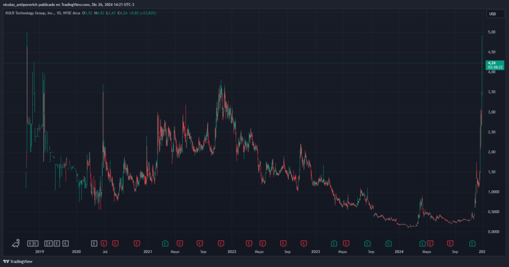 Las acciones de KULR (que cotizan en NYSE con el ticker KULR) tienen hoy una subida de casi 25%. De todos modos, la tendencia alcista no comenzó hoy sino que data de inicios de diciembre. Fue precisamente en ese entonces cuando KULR anunció la estrategia de inversión en bitcoin y el precio de las acciones se disparó cerca de 300% en menos de un mes.