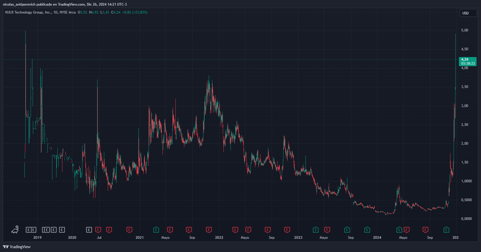 Las acciones de KULR (que cotizan en NYSE con el ticker KULR) tienen hoy una subida de casi 25%. De todos modos, la tendencia alcista no comenzó hoy sino que data de inicios de diciembre. Fue precisamente en ese entonces cuando KULR anunció la estrategia de inversión en bitcoin y el precio de las acciones se disparó cerca de 300% en menos de un mes.