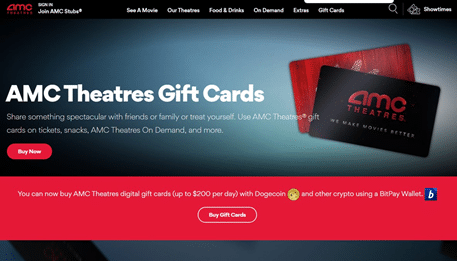 El ejecutivo de AMC adelantó que esperan añadir dogecoin (DOGE) a la lista de criptoactivos con los que se puede pagar por los productos y servicios que ofrece la empresa. Sin embargo, en el sitio web de esta cadena de cines anuncian que ya es posible comprar tarjetas de regalo (gift cards) usando DOGE, por medio del procesador de pagos BitPay.