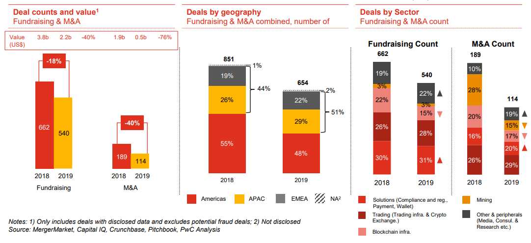 Según indica el Segundo Reporte Global sobre Criptomonedas y Recaudación de Fondos, durante el año 2019 se concretaron 114 acuerdos de compra o fusión de estas empresas por un valor de USD 451 millones; pero previamente (2018) se habían contabilizado 189 acuerdos por un total de USD 1,9 mil millones. Lo que hoy muestra un descenso de 40% en la cantidad de acuerdos y 76% en cuanto al valor de estos.