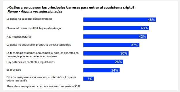 Así, “las principales barreras para entrar al ecosistema cripto son no saber por dónde empezar y la volatilidad del mercado, seguidas del miedo a las estafas”, concluye la firma. En ese sentido, la menor disposición a invertir se encontró entre las personas mayores de 65 años.