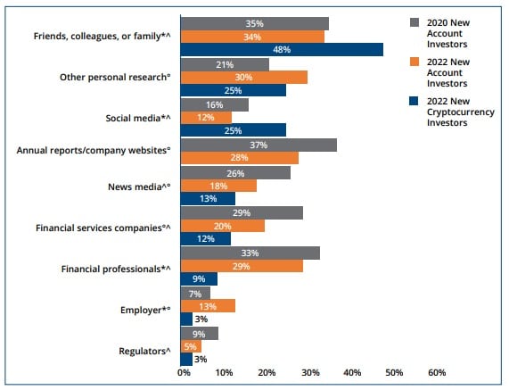 Al seguir indagando sobre la forma en que los inversionistas novatos se actualizan sobre el mercado de criptomonedas, el estudio encontró igualmente que la principal fuente de información son los amigos, familiares y compañeros de trabajo (48%). La segunda fuente son las redes sociales (25%), seguida de los medios de noticias (13%).
