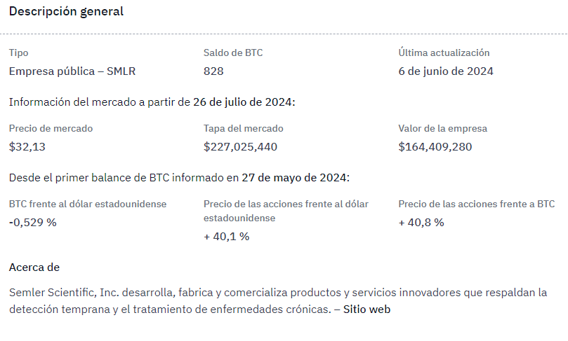 Tal como puede verse en el portal BitcoinTreasuries, Semler Scientific aún conserva sus 828 BTC.
