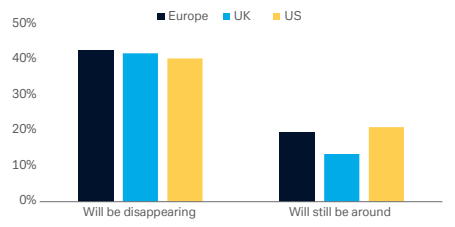 Las posturas optimistas y pesimistas tienen peso semejante en otras respuestas del estudio. Así, mientras el 40% de los encuestados piensa que BTC prosperará en los próximos años, el 38% espera que desaparezca.