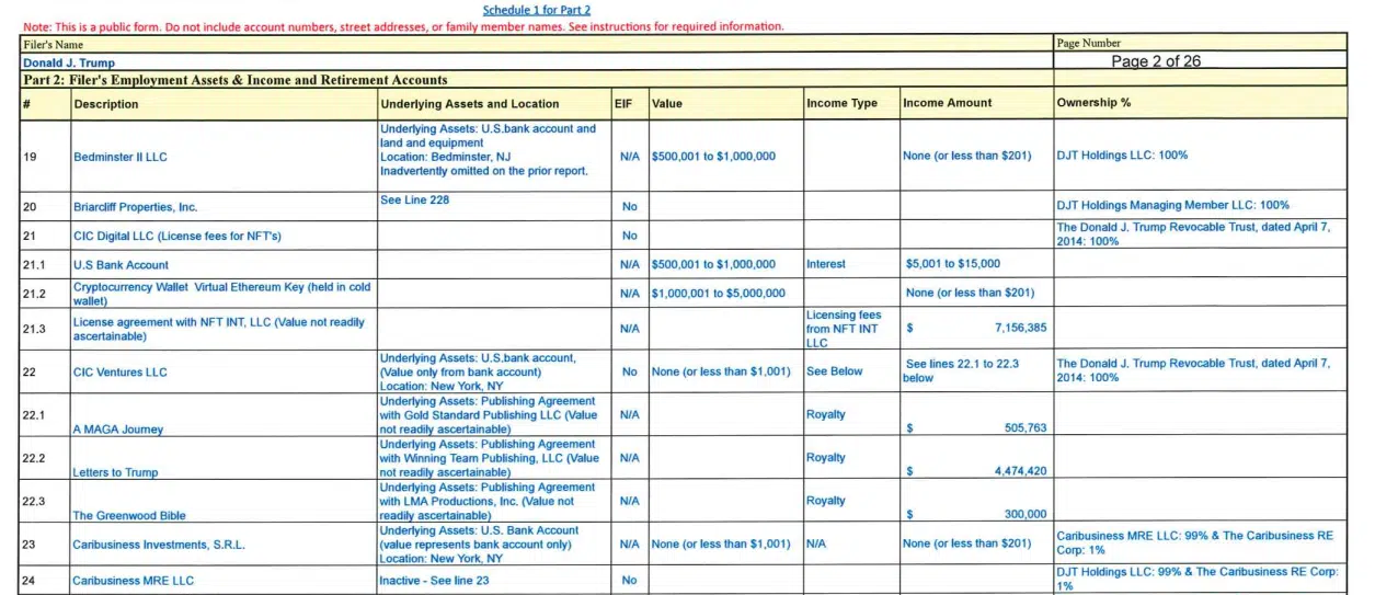 Tal como muestra la declaración financiera personal, divulgada por el organismo de control ético Citizens for Ethics, el expresidente declaró tenencias de entre 1 y 5 millones de dólares en criptomonedas. Prácticamente todos los criptoactivos declarados están basados en la red Ethereum.