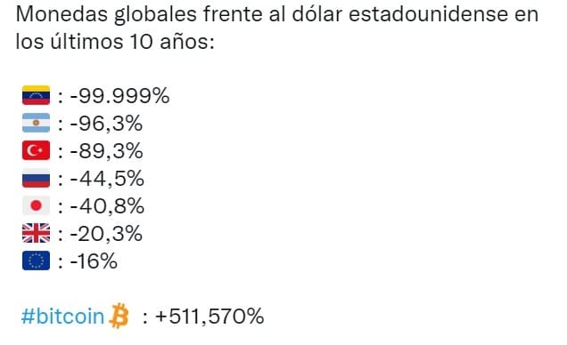 La inflación que devalúa el dinero es realmente crítica en gran parte del mundo. De hecho, varias monedas nacionales se han devaluado por encima del 16% (euro) y hasta el 100% (bolívar de Venezuela), como lo revela un gráfico de Bitcoin Magazine.