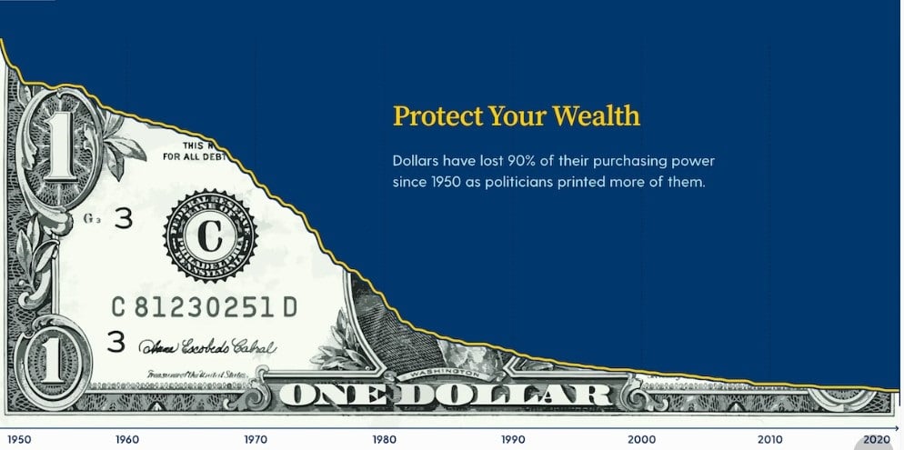 “El dólar de hoy valdría menos de 4 centavos en 1913”, señaló el instituto. Y esta devaluación seguirá en progreso mientras la Reserva Federal de Estados Unidos siga imprimiendo más dinero que causa inflación monetaria.