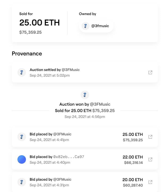 La compañía llamada 3F Music, con sede en Dubái, se quedó con el token no fungible.