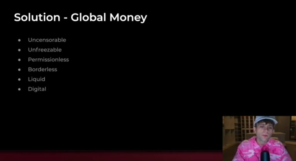 Bitcoin es dinero global, que es valorado igual en todos lados, en todo momento por todos en el mundo; no está localizada, es un sistema abierto, es una política monetaria que es defendida por una red distribuida de pares. No hay punto central de fallo, no hay gobierno que pueda tomarlo y cambiarlo; trabaja 24/7, es confiable y suficientemente descentralizado para sobrevivir.