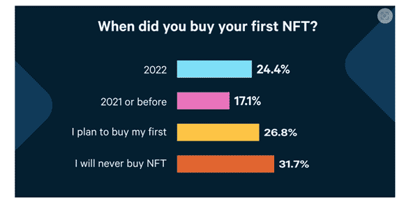 La firma también revela que más de la mitad de los encuestados (51,5%) no invertiría en un NFT en pleno mercado bajista. En contraste, un 35,2% de los participantes está en plena disposición de desembolsar fondos por uno de estos coleccionables digitales.