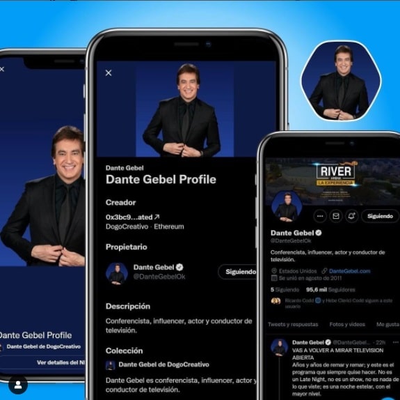 No obstante, la publicación incluye una imagen donde se puede ver un móvil con lo que sería una vista parcial de una dirección de un monedero de Ethereum. Además, se aprecia el perfil de Dante Gebel en una aplicación de la empresa Dogo Digital, un proveedor de soluciones para incursionar en los metaversos y los NFT.