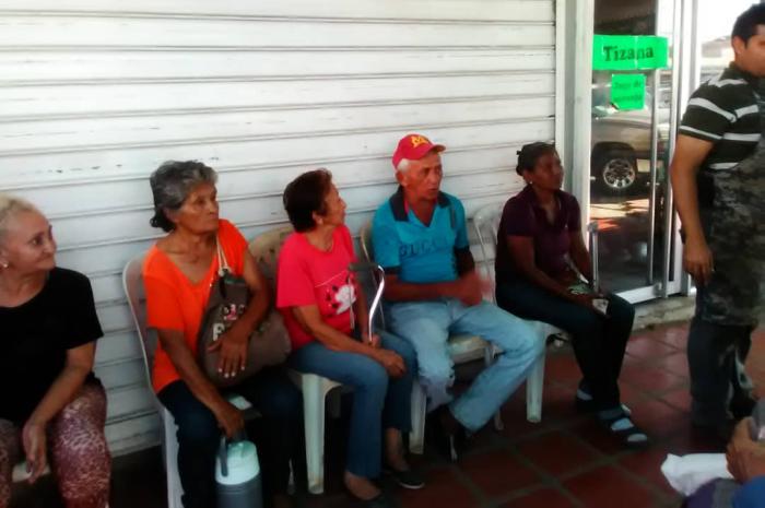 En el lugar se hacen dos filas. Una para los pensionados o trabajadores públicos en condiciones físicas estables y otra para los pensionados que están incapacitados, en sillas de ruedas, con muletas o que sufren de alguna enfermedad crónica. A estos últimos les dan prioridad, mientras que el resto de los beneficiados espera afuera del establecimiento.