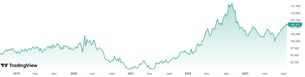 El siguiente es un gráfico del DXY, índice que muestra el poder del dólar estadounidense en comparación con otras monedas nacionales. Puede observarse cómo está cerca de su punto más alto, en los últimos 5 años.