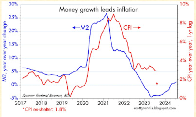 “Este gráfico es la prueba irrefutable de que el origen de nuestro gran episodio inflacionario fue el gasto deficitario”, dice el economista estadounidense. “He sido uno de los pocos observadores que han relacionado el crecimiento excesivo de M2 (es decir, la impresión de dinero) con el gran problema de inflación que golpeó a la economía estadounidense”, profundiza.