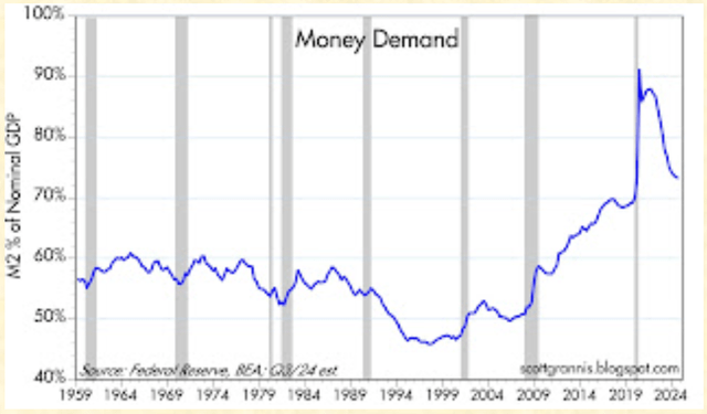 Según su visión, el siguiente gráfico, que muestra la demanda de dinero, sugiere que habrá un año más o menos de inflación baja en los Estados Unidos. Esta, a nivel anual, se ha mantenido disminuyendo desde mediados del 2022 hasta mediados del 2023, momento desde el cual se encuentra alrededor del 3%.