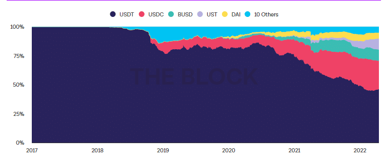 Según gráficos del portal The Block, la dominancia de USDT dentro de las stablecoins se ha visto considerablemente reducida, luego de que otros competidores, un poco más pequeños, entraran en juego. Entre ellos están USD Coin (USDC), Binance USD (BUSD) y TerraUSD (UST). Estas últimas tres cuentan con poco menos del 10% del mercado cada una, mientras que USDC posee más del 25%.