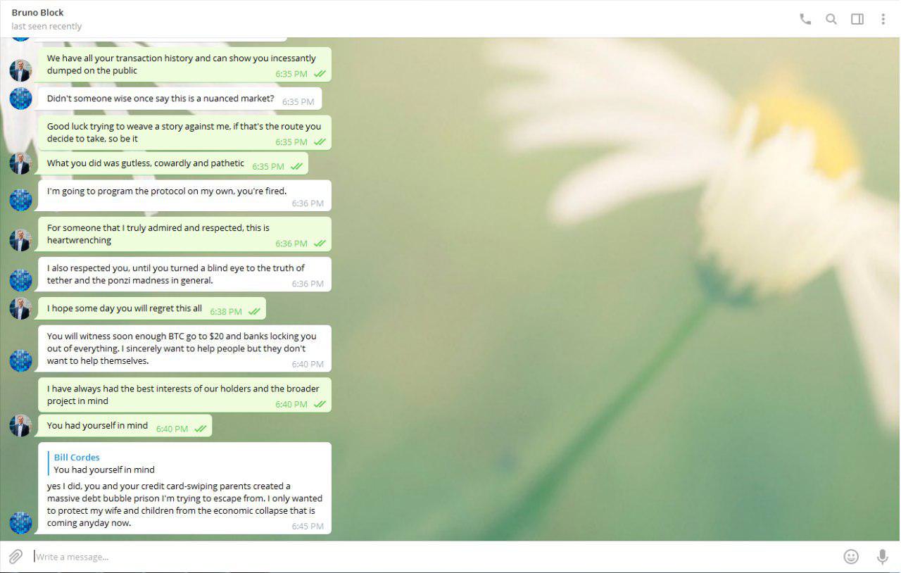 Un usuario de Reddit publicó una captura de un chat de Whatssapp llevado a cabo entre Bruno Block y Bill Cordes, en donde Block afirma que programará el protocolo él mismo y que Cordes está despedido. Además le dice “Te respeté hasta que cerraste tus ojos a la verdad de lo que sucede con Tether y la locura Ponzi en general”, pareciendo sugerir que las dinámicas actuales de mercado se asemejan en general a este tipo de esquema fraudulento. Luego, finaliza diciendo que lo hizo pensando en el bienestar suyo, de su esposa e hijos, ante “la crisis financiera creada por ti y tus padres y esa prisión de la burbuja financiera de la deuda” de la que intenta escapar.