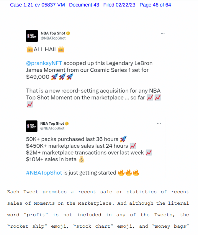 En el documento, el juez citó los tuits relacionados con la venta de una serie de tokens no fungibles (NFT) de la empresa Dapper Labs, por el orden de los USD 49.000, acompañada de los respectivos emojis. Marrero consideró que los emojis usados en la red social sugerían que los NFT ganarían valor.