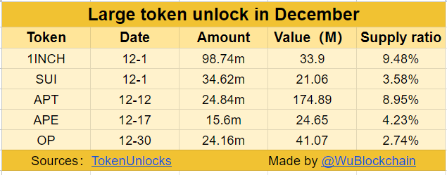 Los mayores desbloqueos de tokens programados para diciembre incluyen a 1INCH, SUI, Aptos (APT), Apecoin (APE) y Optimism (OP). Todo ello es por un valor de casi 300 millones de dólares (USD). Puede verse esto desglosado en la imagen que figura a continuación.