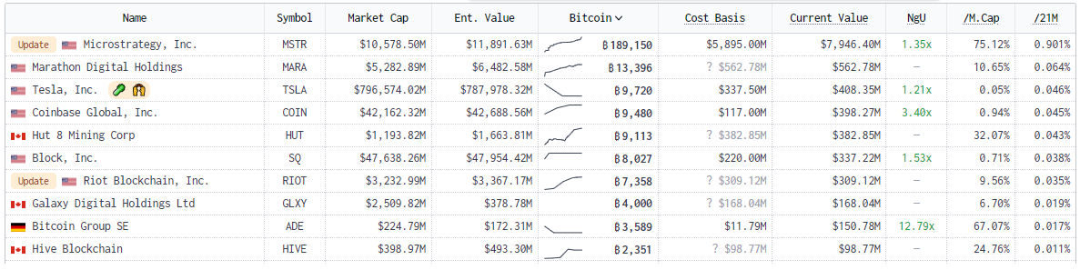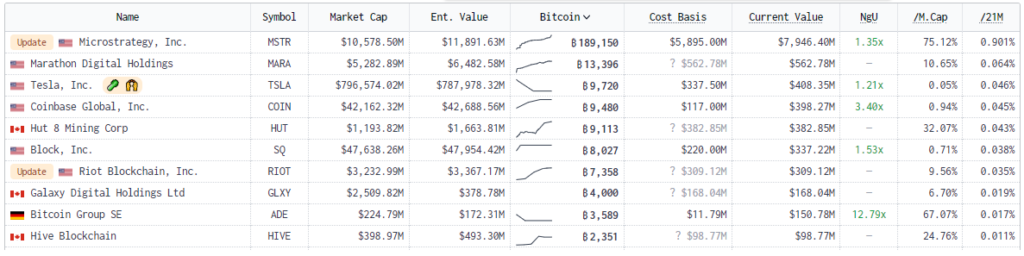Según la firma de inversiones y finanzas, Goldman Sachs, 2023 fue el año de la adopción institucional de bitcoin. La siguiente tabla, tomada del sitio web BitcoinTreasuries.net, muestra las 10 empresas cotizadas en bolsa con mayor cantidad de BTC en sus tesorerías: