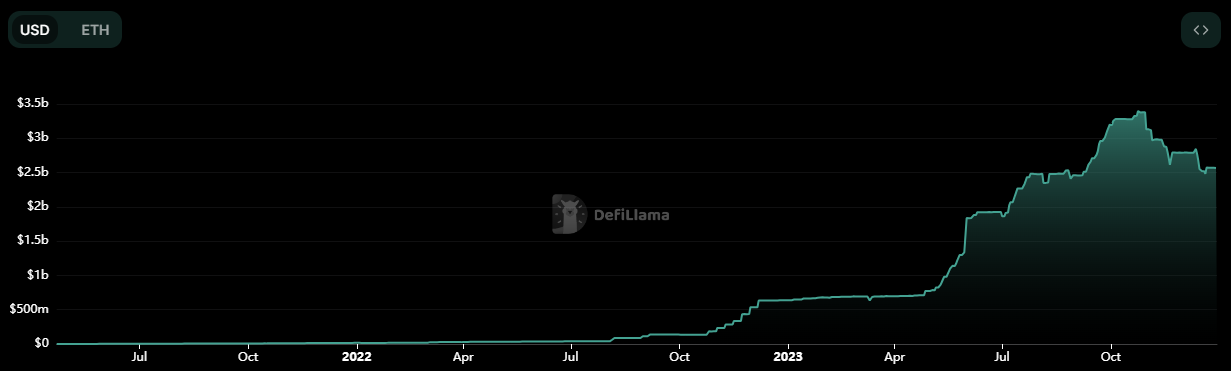 El siguiente gráfico, provisto por el portal DefiLlama, muestra el valor total depositado tan solo en Maker-RWA, el principal protocolo de finanzas descentralizadas (DeFi) especializado en RWA. Como puede verse, la cifra supera los 2.500 millones de dólares (o 2,5 billions, en inglés).