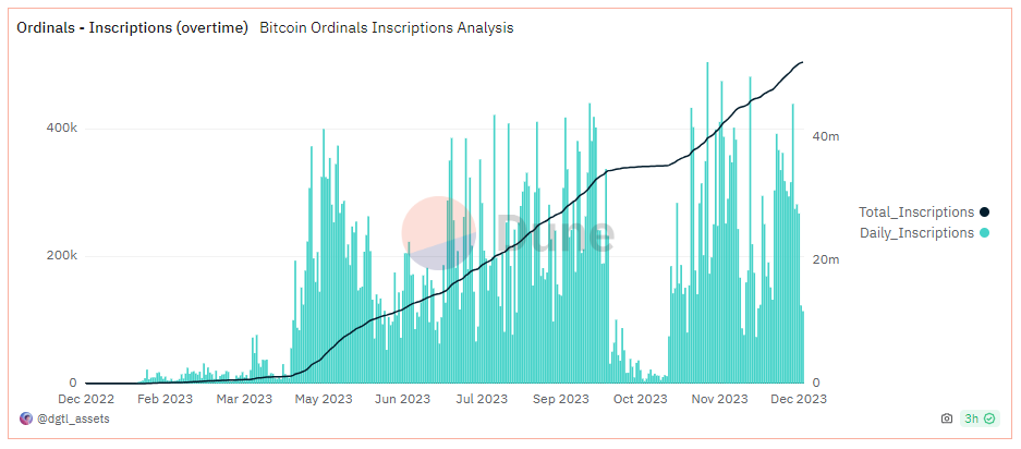 Según datos de Dune Analytics, hasta el momento de esta publicación se efectuaron más de 52 millones de inscripciones en el protocolo Ordinals, por las que se pagó más de 5.161 bitcoins en comisiones. En el siguiente gráfico se aprecia cómo han aumentado las inscripciones a lo largo de 2023: