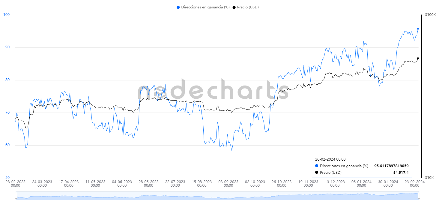 Con bitcoin oscilando alrededor de 57.000 dólares (su precio máximo desde noviembre de 2021), el 95% de las direcciones de bitcoin está en ganancias, de acuerdo con datos de la firma analítica Nodecharts, al momento de esta publicación.