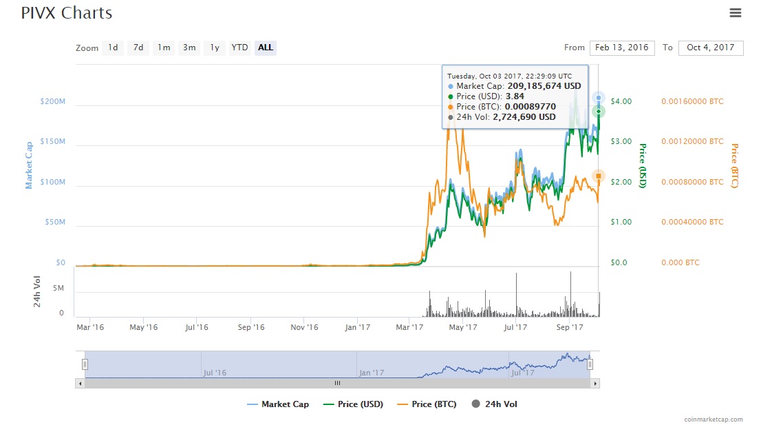En el caso de PIVX, se observa un crecimiento en su capitalización que alcanza los 186.844.830 y un volumen de intercambio de más de 5 millones de dólares en las últimas 24 horas, principalmente en las casas de cambio Bittrex, Crytopia y YoBit. Esto puede deberse a los últimos anuncios que realizó el proyecto a través de su cuenta en la red social Twitter respecto a nuevas actualizaciones que tendrán lugar durante los próximos días de octubre.