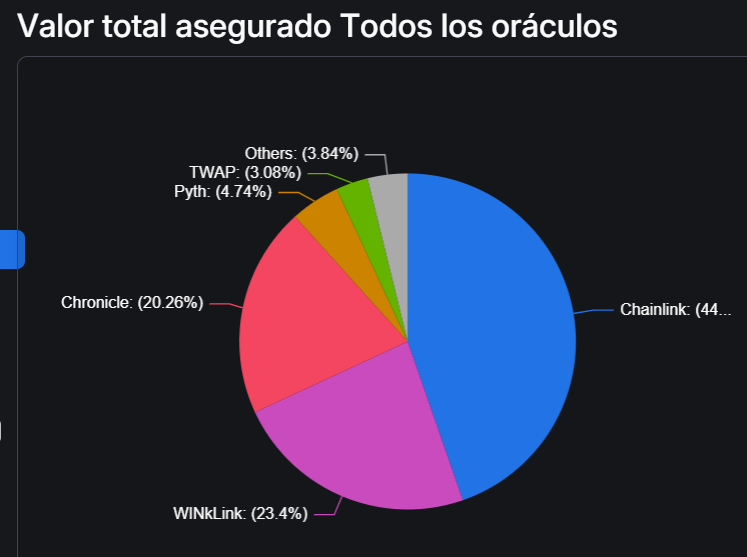Pyth, diseñado en la red Solana, tiene actualmente 1.500 millones de dólares en valor total asegurado (TVS) en 120 protocolos, convirtiéndose en el cuarto oráculo de precios más grande. Chainlink, a quien le compite directamente, tiene en comparación 14.700 millones de dólares en TVS, según datos de DeFiLlama que se pueden apreciar en el siguiente gráfico.