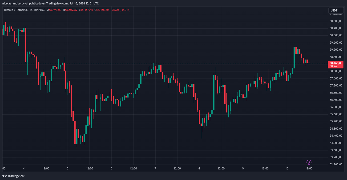 Al momento de esta publicación, tal como puede verse en el siguiente gráfico de TradingView, cada BTC se comercia por alrededor de 58.500 dólares en los principales exchanges: