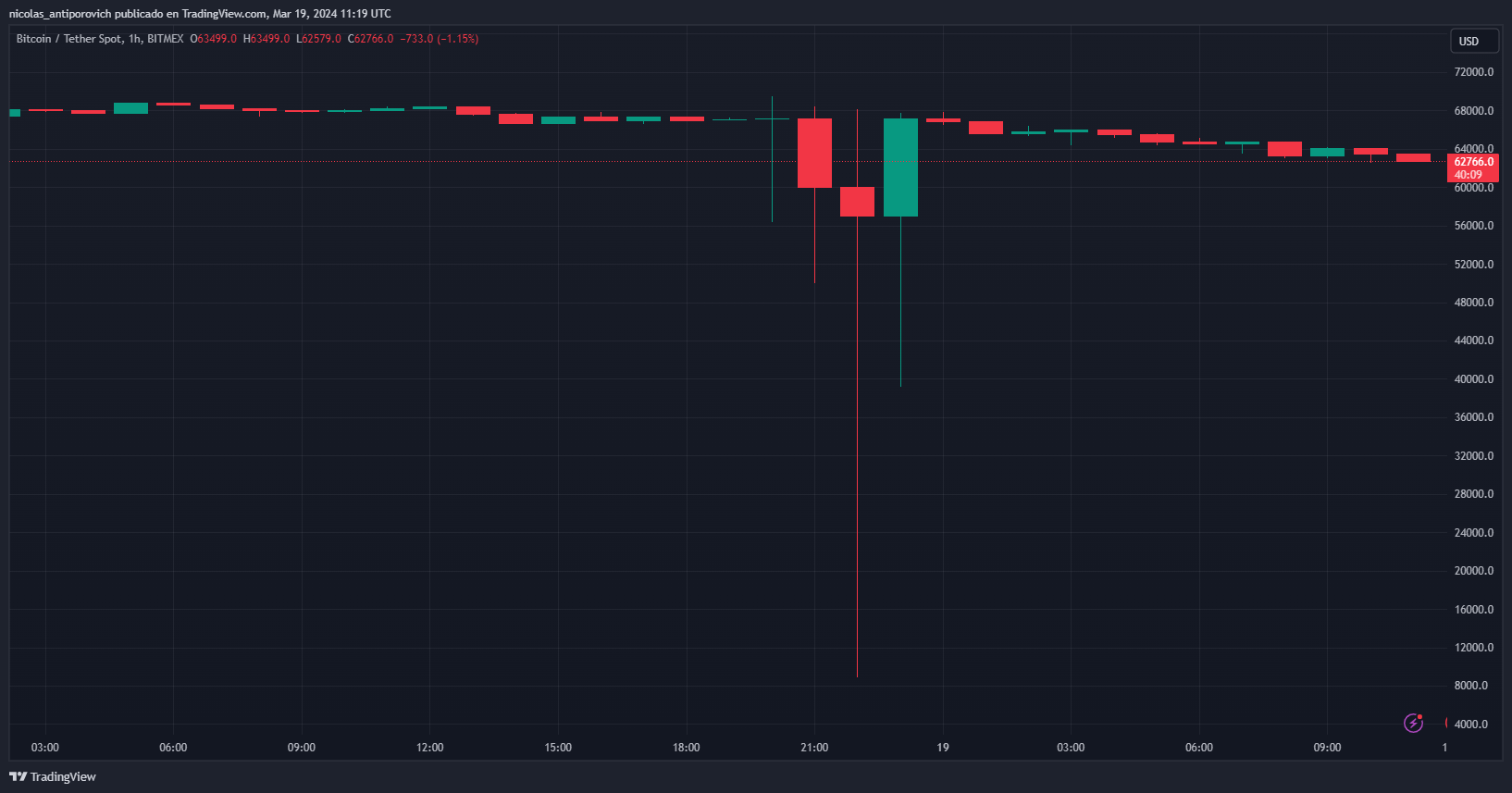 Este episodio extraordinario (en el más literal sentido de la palabra, fuera de lo ordinario) ocurrió la noche del lunes cuando, debido a órdenes de venta por valor de 55,49 millones de dólares, el precio de bitcoin se desplomó hasta los 8.900 dólares en el exchange BitMEX, mientras que en otros exchanges el precio se mantenía por encima de los 63.000 dólares.