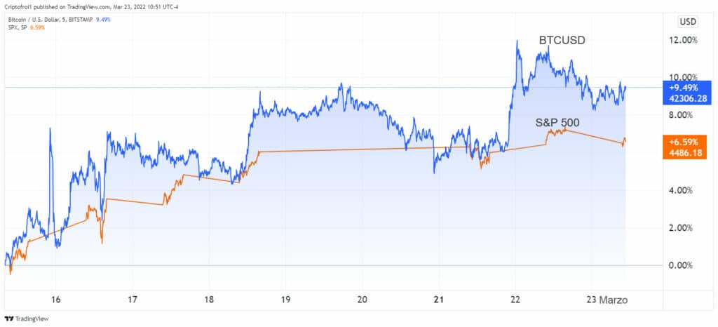 Pero en la última semana, como se aprecia en el gráfico, si bien S&P 500 exhibe un repunte de 6,6%, bitcoin logra superar a este importante índice bursátil con casi 10% de apreciación en el mismo período. En el corto plazo, el piso de bitcoin sigue elevándose y acercándose más a los USD 42.000, tal como lo reportó CriptoNoticias este martes 22.