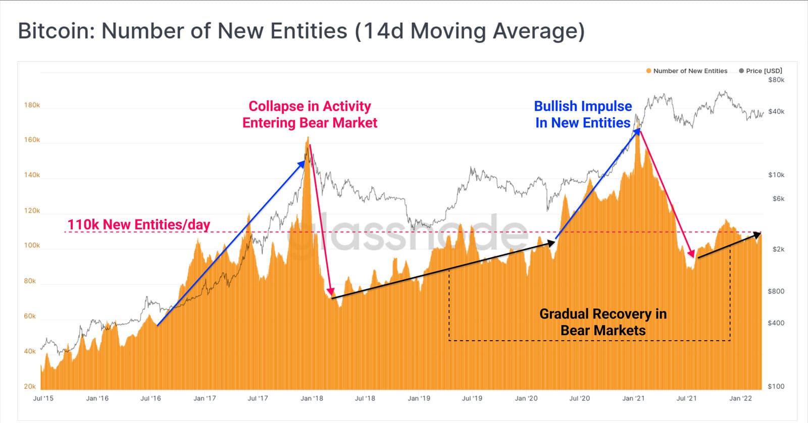 Los impulsos pronunciados de las nuevas entidades, marcados con flechas azules en el gráfico, corresponde a las corridas alcistas de 2016-2018 y la ocurrida entre 2020 y 2021. La última fase de la evolución de las entidades On-chain es una recuperación gradual desde julio de 2021 hasta la actualidad. En pocas palabras, este es un fenómeno que suele ocurrir cuando el precio se prepara para una corrida alcista.