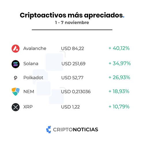 El top semanal está encabezado por Avalanche (AVAX), que creó un fondo de incentivo para desarrolladores; y Solana (SOL), que logró un nuevo máximo histórico y llegó al cuarto puesto por capitalización de mercado.