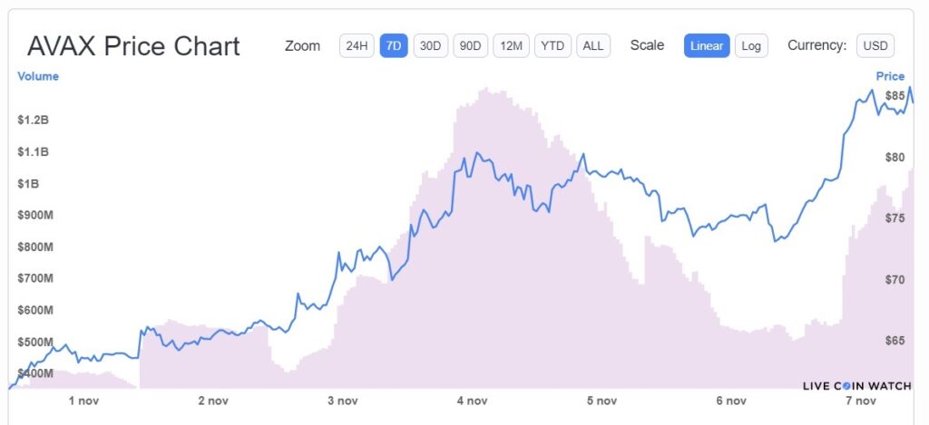 El precio de AVAX, el token de la red mantiene un alza constante desde la fecha de este anuncio, llegando a un máximo de USD 85,5 este 7 de noviembre. El crecimiento promedio semanal se estima en más de 40%.
