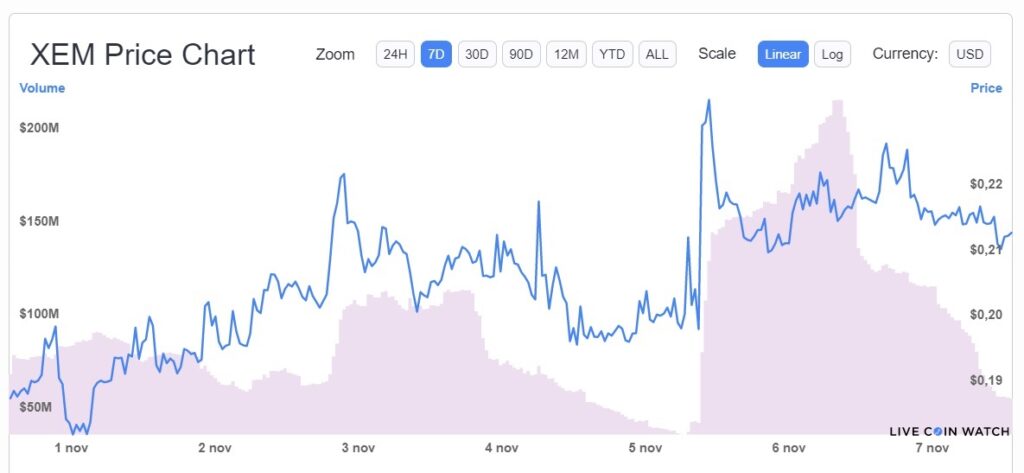 En promedio XEM subió más de 18% en una semana. La capitalización de mercado es USD 1.184 millones y el volumen de comercio diario es de USD 53,5 millones.