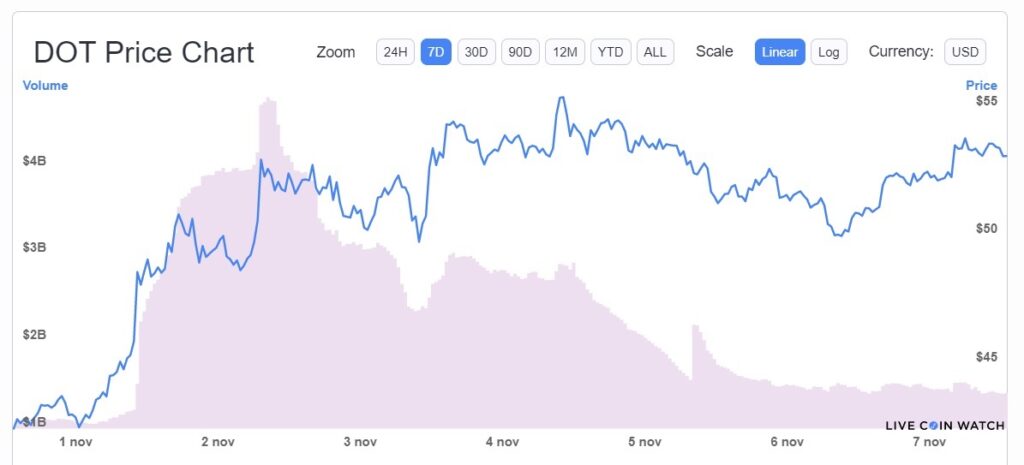 En este contexto, la criptomoneda DOT aumentó alrededor de 26% en siete días. Al cierre de esta edición la capitalización de mercado es de USD 54.312 millones y el volumen de comercio diario es de USD 1.305 millones.