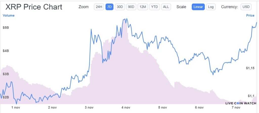En este contexto, hubo un avance significativo en el valor de la criptomoneda de Ripple en estos siete días, con un alza continua desde el 3 de noviembre. XRP llegó a un pico de USD 1,23 el día 4, una cifra a la que vuelve a acercarse este 7 de noviembre, luego de experimentar varios altibajos.