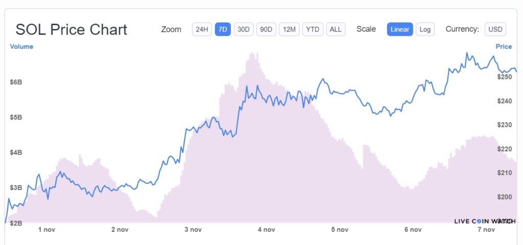 De acuerdo con datos de Live Coin Watch, SOL, el token de Solana, esta semana registró un nuevo máximo histórico (ATH) al cotizarse sobre los USD 250 el 6 de noviembre. El repunte de precio causó además un aumento en la capitalización de mercado de la red, al superar los USD 72.500 millones.
