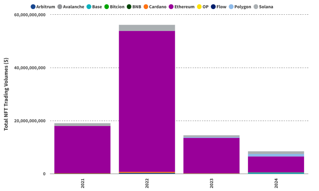 “El mercado bajista de 2022-2023 asestó un duro golpe al sector de los NFT, con un desplome del volumen de operaciones del 39% desde 2023 y un asombroso 84% desde 2022”, mencionan Sigel y Bush.