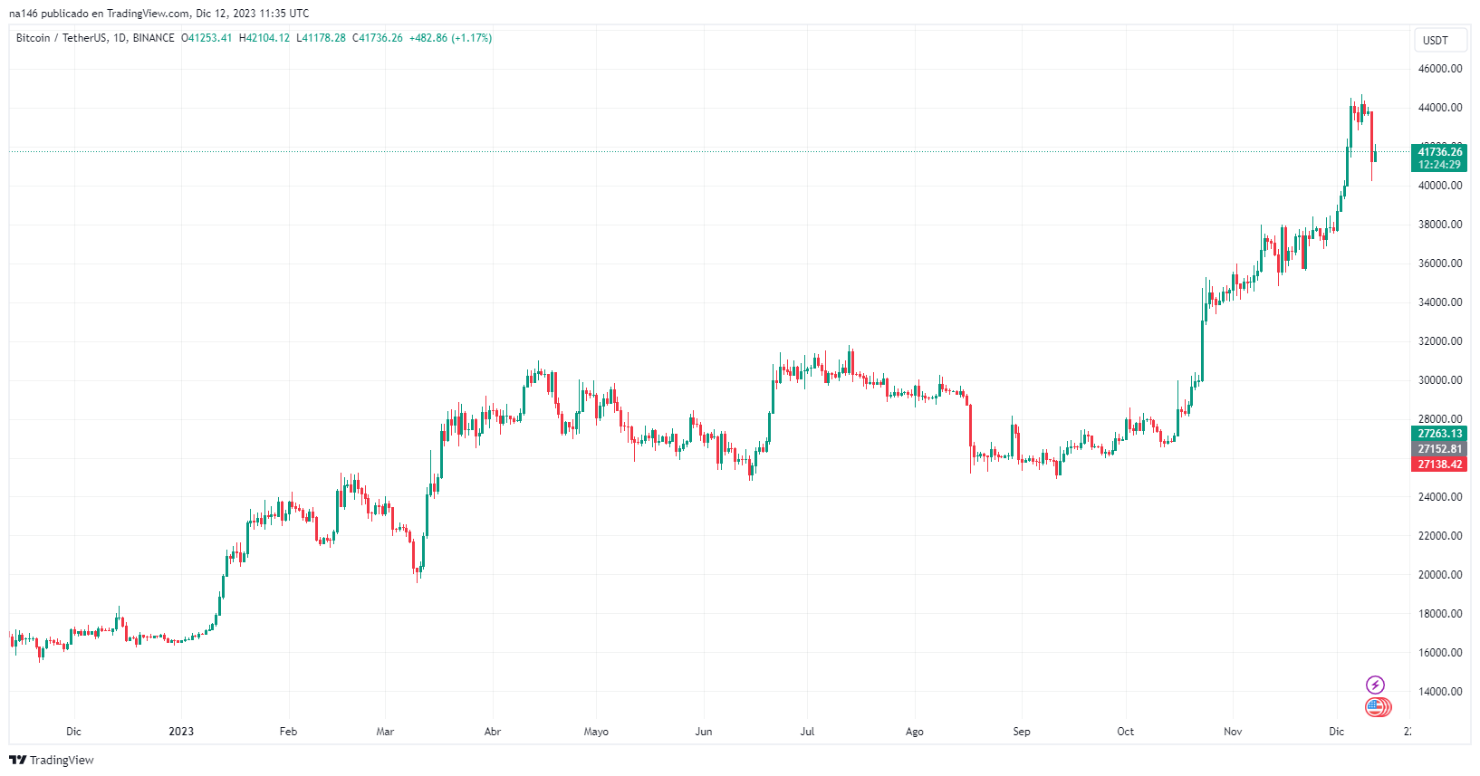 En el siguiente gráfico de precio, provisto por TradingView, se observa la apreciación que tuvo BTC desde enero de 2023. Queda en evidencia que la caída de los últimos días es —al menos por ahora— una corrección menor:
