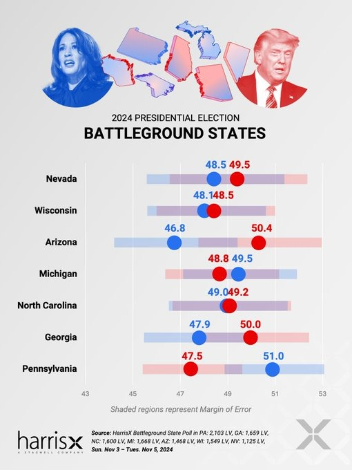 La empresa consultora HarrisXData, por ejemplo, informa que Trump sería ganador en Arizona, Georgia, Nevada, Pensilvania y Wisconsin.
